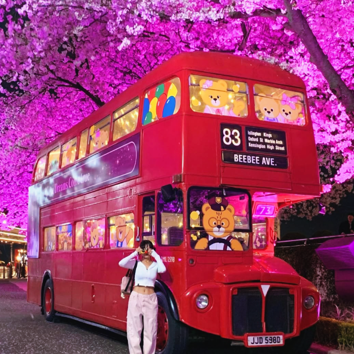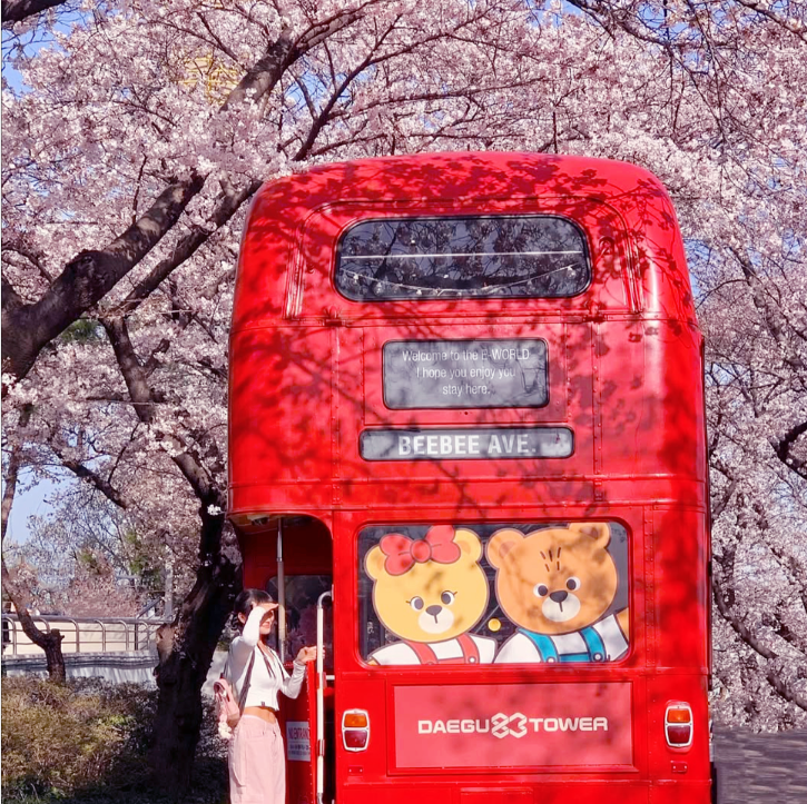 83타워 벚꽃 로드 : 이월드 대표 벚꽃 명소인 빨간 2층 버스는 전국에서 가장 유명한 벚꽃 스팟 중의 하나이다. 마치 유럽에 여행 온 것 같은 이국적인 2층 스쿨버스와 벚꽃 앞에서 인생 샷을 찍어 보세요.